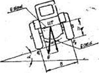 Устойчивость мобильной машины - это способность сохранять им заданное положение или движение без опрокидывания, сползания и заноса. Потеря устойчивости происходит при передвижении с недопустимым поперечным или продольным уклоном, под воздействием центробежных сил и других возмущающих сил на поворотах и при заносах. Обеспечение надежной поперечной и продольной устойчивости тракторов, особенно колесных, является важнейшим условием их безаварийной и безопасной работы. Добиться ее можно различными путями. Поперечная устойчивость трактора обеспечивается в том случае, если удерживающий момент силы G—cosa будет больше опрокидывающего момента силы G h4sma, т. е. [35] G-hn -sma<G — cosa, (10.6) где G - вес трактора, агрегата, Н; hu - высота центра тяжести, м; В - ширина колеи трактора, м; а - статический угол поперечного наклона пути, град (рис. 10.3);