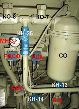 1. Во время работы компрессора управляющая полость клапана К-8, вентиль ВСО, реле РДСО и РДК связаны через регулятор РЕГ (3РД) с атмосферой. Клапан К-8 закрыт. Катушка вентиля ВСО обесточена, вентиль открыт.