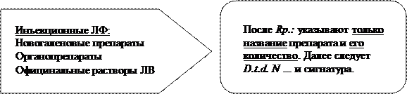 При выписывании сухого вещества в ампулах (порошки, лиофилизированные массы) указывают название вещества и его количество в одной ампуле. Затем, следует указание, сколько таких доз надо отпустить в ампулах, и сигнатура: указывают порядок растворения, разведения вещества, путь введения раствора, время инъекций. Кроме указанных ЛФ, в ампулах выписывают новогаленовые препараты, жидкие органопрепараты, официнальные растворы лекарственных веществ. Во всех этих случаях после Rp.: указывают только название препарата и его количество. Далее следует указание о количестве доз и сигнатура. Многие ЛС для инъекций (порошки, растворы, суспензии и др.) выпускают во флаконах. Флаконы удобны тем, что непосредственно перед применением можно асептически готовить ЛС во флаконе (растворять, разводить). Кроме того, содержимое флакона можно вводить в несколько приемов, сохраняя при этом стерильность препарата. При выписывании флаконов в рецептах соблюдаются, в общем, те же правила, что и при выписывании лекарств в ампулах. Отличие заключается в том, что после указания количества флаконов никаких обозначений не делают (слово «флаконы» нигде не упоминается!). ЛФ для инъекций, которые изготавливают в аптеках по магистральным прописям, выписывают по правилам прописывания соответствующих неинъекционных форм, но в рецепте дается указание на необходимость их стерилизации. Выписываются данные ЛФ сокращенно и развернуто. В рецепте после обозначения лекарства отмечают – Sterilisetur! (Пусть будет простерилизовано!). Если лекарство содержит несколько ингредиентов, после их перечисления пишут M. Sterilisetur! Затем следует указание о выдаче и способе употребления. Различия в выписывании ЛФ для инъекций суммирует следующая таблица.