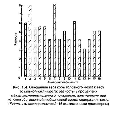 Результаты говорят о том, что мозг крыс, выращенных в обогащенных условиях, отличается от мозга крыс, выращенных в обедненных условиях, во многих отношениях. Кора головного мозга крыс из обогащенных условий значительно тяжелее и толще. Кора головного мозга — это та часть мозга, которая отвечает на воздействия окружающей среды и контролирует движение, память, обучение и чувственное восприятие (зрение, слух, осязание и обоняние). Кроме того, уровень активности упомянутого выше фермента нервной системы, ацетилхолинестера-зы, оказался выше у крыс с обогащенным жизненным опытом У двух групп животных не было выявлено значительной разницы в числе клеток мозга (нейронов), но в обогащенных условиях у крыс развивались нейроны большего размера. С этим связаны и данные о том, что соотношение РНК и ДНК — веществ, играющих важнейшую роль в росте клеток мозга, — было выше у крыс с обогащенным опытом Это говорит о том, что у этих животных уровень химической активности мозга был выше. Розенцвейг и его коллеги с уверенностью утверждают, что «хотя различия в мозге, вызванные условиями окружающей среды, невелики, но они подлинны. При повторных экспериментах вновь и вновь выявлялись те же закономерности и различия... Оказалось, что наиболее стойким показателем воздействия жизненного опыта на мозг было соотношение веса коры мозга к остальной его части: подкорке. Оказывается, кора головного мозга очень быстро увеличивается в весе в ответ на внешнюю стимуляцию, в то время как остальная часть мозга изменяется мало» (р. 25). Это измерение отношения веса коры и остальной части мозга было наиболее точным показателем изменений мозга. Общий вес мозга варьируется в зависимости от индивидуального веса каждого животного, выбранный же показатель исключает влияние индивидуальной изменчивости. На рис 1.4 представ- лены данные по этому показателю, полученные во всех 16 экспериментах. * Как вы видите, только в одном эксперименте различия не являлись статистически значимыми. И наконец, были получены данные, касающиеся мозговых синапсов у животных из двух экспериментальных групп. Си- напс — это место соединения двух нейронов. Основная часть активности мозга реализуется в синапсах, где нервный импульс или передается от одного нейрона к следующему и дальше, или тормозится и прекращается. Под большим увеличением с исполь- ванием электронного микроскопа было обнаружено, что сами инапсы у крыс с богатым опытом на 50% больше, чем у крыс,