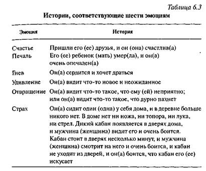 Исследование Экмана и Фризена основывалось на теории, предполагавшей, что специфические выражения лица, соответствующие основным эмоциям, универсальны. Экман и Фризен сформулировали свои основные посылки довольно просто: Цель данной работы — проверить гипотезу о том, что представители культуры, еще даже не знающей письменности, которая была выбрана для обеспечения максимальной изоляции от более развитых культур, будут идентифицировать по соответствующим выражениям лиц те же самые эмоции, что и представители современных западных и восточных культур (р. 125). МЕТОД Наиболее изолированной подгруппой племени являлась южный фор. Люди, выбранные для участия в исследовании, не смотрели кинофильмов, не говорили ни на английском языке, ни даже на ломаном английском, не работали на фирмы или компании с Запада и никогда не жили ни в каком из подверженных влиянию Запада поселений региона. Для участия в исследовании было выбрано 189 взрослых и 130 детей из общей популяции жителей южного фора, составляющей около 11 000 человек. Для сравнения были выбраны также 23 взрослых человека, имевших наибольший опыт контактов с западным обществом через кинофильмы благодаря жизни в западных поселениях и посещению миссионерских школ. Путем проб и ошибок исследователи нашли наиболее эффективный способ получения ответов на интересующие их вопросы. Они показывали участникам исследования три фотографии с различными выражениями лица и читали краткое описание эмоциональной сцены или эмоционально насыщенную историю, которая соответствовала одной из трех фотографий. Затем испытуемому достаточно было просто указать, какое из трех выражений лучше всего соответствовало прочитанной истории. Истории выбирались очень тщательно, чтобы гарантировать, что каждая из них связана только лишь с одним эмоциональным состоянием и что она вполне понятна людям этого племени. В табл. 6.3 приведены шесть историй, придуманных Экманом и Фризеном. Авторы поясняют, что описание сцены, вызывающей страх, было сделано более подробным для того, чтобы испытуемые не путали его с удивлением или гневом. Сорок фотографий разных людей, включая мужчин, женщин, мальчиков и девочек, были использованы как образцы выражения шести эмоциональных состояний. Эти фотографии предварительно оценивались представителями различных других культур. Каждая фотография была идентифицирована по меньшей мере 70% участников исследования из по меньшей мере двух цивилизованных западных или восточных культур, с тем чтобы сделать их репрезентативными в отношении выражения эмоций. Сам эксперимент проводился командами, состоящими из одного члена исследовательской группы и одного члена местного племени, который объяснял испытуемым зада