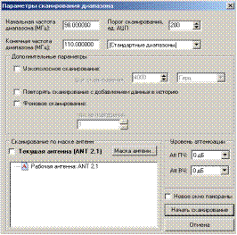 Поместите включенный тестовый передатчик в Помещение 1. Передатчик в помещении расположите на максимальном расстоянии от антенны в направлении других контролируемых объектов (наихудшие условия приёма и сравнения сигналов). Определите амплитуду сигнала на рабочей антенне ANT 2.1, и сравните ее с амплитудой сигнала на опорной антенне ANT 2.4. Если передатчик маломощный, на опорной антенне приём сигнала может отсутствовать. Амплитуда сигнала на опорной антенне ANT 2.4 должна быть меньше, чем на рабочей антенне ANT 2.1. Для проверки работоспособности метода РИФ (вычитание сигнала опорной антенны) проделайте следующее: а) Установите текущей антенну ANT 2.4. (Опорную). В главном меню программы «АКОР-3» выберите пункт «Команды – Цифровое сканирование» (либо нажмите клавишу F3). При выполнении данной команды открывается окно «Параметры сканирования диапазона (Рис. 3.3.3).