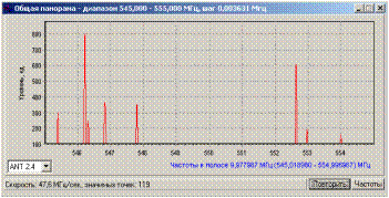 Рис 3.3.3 Окно «Параметры сканирования диапазона» В полях «Начальная частота» и «Конечная частота» установите диапазон сканирования в пределах 5- 10 МГц, в который попадает тестовый передатчик. Например, если тестовый передатчик работает на частоте 551 МГц, установите диапазон 545 – 555 МГц. Убедитесь, что флажок «Узкополосное сканирование» не установлен. В секции окна «Сканирование по маске антенн», установите флажок «Текущая антенна ANT 2.4». Нажмите кнопку «Начать сканирование». б) В открывшемся окне «Общая панорама» вы увидите результат сканирования диапазона по опорной антенне ANT 2.4 (Рис. 3.3.4).