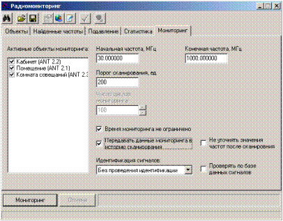 Рис. 3.6.1 Радиомониторинг можно проводить не по всем объектам, а только по выбранным. Если вы не желаете проводить мониторинг по всем объектам, пометьте нужные вам объекты в списке «Активные объекты мониторинга». Внимание! Для начала мониторинга нужно пометить в списке хотя бы один активный объект. Начальная и конечная частоты сканирования при мониторинге могут соответствовать параметрам адаптации, или же могут быть выбраны произвольно внутри диапазона частот, для которого была проведена адаптация. Например, вы могли провести адаптацию для диапазона частот 30 – 3000 МГц, а мониторинг проводить в диапазоне 100 – 200 МГц. Параметры мониторинга можно изменять в произвольный момент времени – это никак не скажется на результатах ранее проведенной адаптации. Если проводится радиомониторинг эфира, диапазон частот мониторинга может быть задан произвольно. Опция «Порог сканирования» задает минимальный уровень сигнала, который должен быть превышен для попадания в результаты мониторинга. Внимание! При проведении радиомониторинга эфира и задания большого диапазона (более 200 – 400 МГц) рекомендуется устанавливать начальный порог равным 1000 – 2000 ед. Примечание. Если объекту назначены особые параметры, то эти особые параметры будут иметь приоритет перед параметрами, задаваемыми на вкладке «Параметры мониторинга». Вы можете установить число циклов мониторинга или же указать, что время мониторинга не ограничено. В последнем случае, мониторинг будет выполняться, пока вы его не прервете вручную. Если установлен флажок «Передавать данные в историю сканирования», то все данные сканирования при мониторинге будут передаваться в программу «История сканирования», в которой будет производиться накопление информации о сигналах по времени для последующего анализа. Накопление данных и идентификация в программе «История сканирования» осуществляется только по приоритетному объекту (см. п. 3.4.5.3). Флажок «Не уточнять значения частот после сканирования» позволяет отключить операцию уточнения значений обнаруженных частот, что ускоряет проведение мониторинга, но может привести к занесению в список обнаруженных частот случайных помех. Также в этом случае снизится точность определения частот сигналов. Данный параметр рекомендуется устанавливать при значении порога не ниже 500 ед. Date: 2015-06-11; view: 425; Нарушение авторских прав |