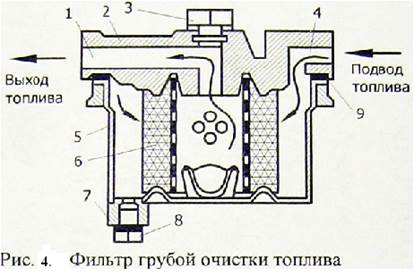 Топливный бак состоит из двух штампованных и сварных половин из листовой стали. (Внутри бака вварены перегородки, придающие ему необходимую жесткость. В нижней части перегородок имеются вырезы для прохождения топлива в отсеки.) В верхнюю часть бака вварена горловина с фильтром, для заливки топлива. Бак оборудован крышкой, подобной радиаторной, с двумя клапанами и прокладкой, обеспечивающей его герметичность. Фильтры грубой очистки. В системе питания дизелей ЯМЗ применяются фильтры грубой и тонкой очистки топлива, включенные в систему последовательно, т. е, через них проходит все топливо. Фильтр грубой очистки топлива имеет сменный фильтрующий элемент 6, вставленный в корпус 5, который сверху закрыт крышкой 2. Между корпусом и крышкой поставлена, уплотнительная прокладка 9. Фильтрующий элемент состоит из хлопчатобумажной пряжи, намотанной на каркас, изготовленный в виде трубки с большим количеством отверстий. При установке фильтрующего элемента в корпус направляющая розетка, приваренная к днищу корпуса, входит в отверстие элемента. Кроме того, плотное соединение фильтрующего элемента с корпусом и крышкой достигается тем, что трехгранные кольцевые рёбра крышки и днища корпуса вдавливаются в мягкие торцовые поверхности. Топливо, подаваемое к фильтру грубой очистки по трубопроводу, проходит через отверстие 4 и постепенно заполняет пространство между корпусом и фильтрующим элементом. Пройдя через слой пряжи, очищенное топливо поступает внутрь каркасной трубки, поднимается вверх и по каналам крышки проходит через отверстие 1 в трубопровод, а затем подается к топливоподкачивающему насосу. На внешней поверхности фильтрующего элемента и на днище корпуса осаждаются механические примеси. Для спуска отстоя из корпуса фильтра в днище имеется отверстие, закрываемое пробкой 8. При заполнении системы питания топливом воздух из фильтра грубой очистки удаляется через отверстие, закрываемое пробкой 3. После замены фильтрующего элемента отвертывают пробку 3 и заполняют фильтр топливом.