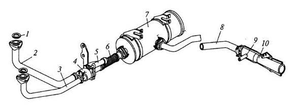 Турбокомпрессор используют для нагнетания воздуха под давлением в цилиндры двигателя. Он состоит из корпуса 3 (рис. 9) и колес 1 и 4 соответственно центробежного компрессора и газовой турбины, которые жестко закреплены на общем валу 2. Отработавшие газы по выпускному трубопроводу 5 попадают в камеру газовой турбины и направляются на лопатки рабочего колеса 4 турбины, заставляя его вращаться вместе с валом 2. Далее отработавшие газы выбрасываются в атмосферу через выпускную трубу. Закрепленное на валу колесо 1 компрессора, вращаясь, засасывает воздух из атмосферы через воздухоочиститель и под избыточным давлением 0,05... 0,06 МПа нагнетает его по впускному трубопроводу 10 в цилиндры двигателя, увеличивая наполнение их воздухом. Колеса турбины и компрессора вращаются с большой скоростью (частота вращения около 600 с-1, или 36000 мин-1). Вал 2 смазывается маслом под давлением из смазочной системы дизеля. Система выпуска отработавших газов Система выпуска служил для отвода газов из цилиндров двигателя и снижения шума. Одновременно система выпуска обеспечивает отсос пыли из воздушного фильтра.
