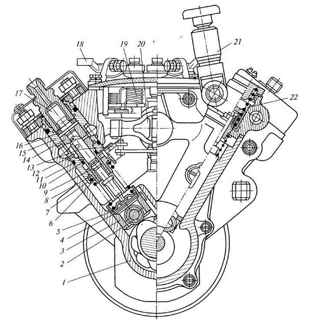 Рис. 12. Насос высокого давления с V -образным расположением секций Работа насоса высокого давления плунжерного типа, установленного на дизелях ЯМЗ, Д-245.12, КамАЗ-740 и ЗИЛ-645, состоит из наполнения надплунжерного пространства топливом с частичным его перепуском, подачи топлива под давлением к форсункам, отсечки и перепуска его в сливной топливопровод. При работе двигателя рейка топливного насоса перемещается в соответствии с изменением подачи топлива, при этом одновременно поворачиваются плунжеры всех секции.