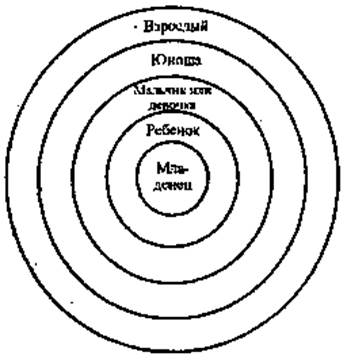 [Надписи (сверху — вниз): Взрослый, Юноша, Мальчик или девочка, Ребенок, Младенец.] Рис. 1. Качества, которые каждый слой добавляет к жизни, могут быть суммированы следующим образом: Младенец = любовь и удовольствие; Ребенок = творчество и воображение; Мальчик или девочка = игривость и развлечение; Юноша = романтика и приключение; Взрослый = реальность и ответственность. Возможно, говоря о качествах, лучше всего сказать, что рост, который мы рассматриваем, — есть развитие и расширение сознания. Тогда каждый слой представляет собой новое ощущение себя и своих возможностей, новое осознание себя и отношения к окружающему миру. Сознание, однако, не является отдельным или изолированным элементом личности. Это есть функция организма, аспект живого тела. Оно развивается в соответствии с физическим, эмоциональным и психологическим ростом тела. Оно зависит от опыта; оно набирает глубину с приобретением навыков; оно находит подтверждение в деятельности. При сравнении слоев с качеством сознания я не имею в виду, что каждое новое измерение себя в определенный возрастной период возникает полностью сформированным. Игривость в действительности начинается в детстве, но достигает своего полного развития после того, как эта фаза проходит. Сознание игры и чувства радости, я думаю, является более характерным для молодых девушек и юношей, чем для детей. Более полное описание каждого слоя и его качеств покажет их соотношение. Младенец характеризуется желанием близости, особенно с матерью. Он хочет, чтобы его держали на руках, заботились, приветствовали и принимали. Любовь, как я подчеркивал в своей более ранней книге, может определяться как желание интимной близости. Когда потребность в близости удовлетворяется, младенец находится в состоянии удовольствия. Лишение этой требуемой близости ведет к болезненному состоянию. Чувство любви во взрослом человеке развивается из этого слоя. У взрослого и младенца оно различается незначительно, хотя формы его выражения могут варьировать. Желание интимной близости лежит в основе всех проявлений любви. Индивидуум, который находится в контакте с младенцем, которым он был и который все еще является его частью, знаком с чувством любви. Он также соприкасается со своим сердцем. Человек заблокирован от переживания полноты любви в той степени, в какой он разъединен со своим сердцем или своим младенчеством. Детство добавляет новое измерение и новое качество жизни. Потребность в длительной близости переходит в новую потребность исследовать мир — потребности, связанной с увеличившейся моторной координацией ребенка. Через изучение людей, вещей, пространства и времени ребенок создает мир в своем воображении. Так как воображение не стеснено структурным чувством реальности, оно свободно. Во время этой фазы оно на сознательном уровне также создает свое ощущение себя, в процессе которого образно исследует возможность быть другим человеком, например своей матерью. Мне кажется, можно сказать, что детство закончилось, когда человек создает связную картину своего личного мира и лично себя. Достигнув этой ступени, мальчик или девочка бросают вызов своему личному миру в игре. Возросшее искусство моторных навыков и игр с другими детьми составляет стиль игры, которая радостна, потому что она свободна и щедро вознаграждаетс