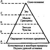 [Надписи (сверху — вниз): Само-сознание; Эго; Мысли, Принципы; Эмоции, Чувства; Ощущение телесных процессов; Естественные и всеобщие процессы; Подъем уровней сознания.] Рис. 46. Осознание процессов в теле является самым глубоким и широким уровнем сознания. Этими процессами являются ритмическое дыхание, вибрирующее состояние мускулатуры, непроизвольные и спонтанные действия, ощущения движения и пульсирующее расширение и сжатие кардиоваскулярной системы. Мы в основном осознаем последнее только в состояниях сильного возбуждения или мистицизма. Это уровень, на котором мы ощущаем наше отождествление с жизнью, природой и космосом. У первобытных людей это сознание описывалось как мистическое соучастие, означающее мистическую идентификацию с природой и всеобщими процессами. В крайнем случае человек теряет ощущение своей уникальной индивидуальности, так как граница себя становится настолько неопределенной, что более не существует отличий личности от окружающего. Это также уровень инфантильного сознания, которое, однако, имеет противоположную от мистического сознания направленность. Первое растет по направлению к дифференциации личности, в то время как последнее движется к недифференцированной личности. По-моему, следующий уровень сознания включает ощущение специфических эмоций. Совсем маленький младенец не чувствует гнева, печали, испуга или счастья. Эти эмоции в некоторой степени зависят от осознания внешнего мира. Например, гнев подразумевает прямую борьбу против «враждебных» сил вне организма. Младенец будет бороться против ограничивающей силы, но его действия будут случайными и ненаправленными. Ему не хватает сознательного контроля движений, и он еще не чувствует природы внешних сил. Эмоции печали означают чувство потери, которое маленький ребенок не может понять. Он плачет в ответ на состояние напряжения, возникающее от болезненного состояния (голод, дискомфорт и так далее). Нельзя сказать, что он не ощущает потери; младенец, плачем зовущий свою мать, плачет потому, что он потерял необходимую связь с матерью, но пока он не рассматривает ее как внешний объект, ассоциирующийся с чувствами удовольствия, он не будет чувствовать потерю. Сознание раскрывается как бутон цветка так медленно, что человек не может постигнуть изменение. Несмотря на это, наше сознание может различать ступени, которые мы можем описать в ходе анализа. Память играет важную роль в функции сознания. Когда ребенок начинает осознавать свои мысли или думать сознательно? Хотя я не могу дать точный ответ на этот вопрос, но уверен, что существует время, когда эти аспекты функции сознания начинают действовать. Мне кажется, что сознание мышления связано с использованием слов, по крайней мере для большинства из нас. Но так как слова возникают при социальных взаимоотношениях и используются при обмене информацией, то эта ступень сознания ассоциируется с ростом познания социального мира. По мере увеличения этого мира собственное пространство человека несколько уменьшается и позиция человека (эго, индивидуальность) становится более определенной. Мышление, сознательное или объективное, дает подъем сознанию эго. Человек видит себя в этом мире как сознательное действующее лицо, которое может выбирать поведение. Важным выбором является, говорить правду или 