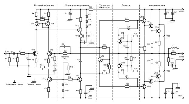 е) усилитель тока на комплементарных тройках транзисторов, включенных по схеме Дарлингтона в каждом плече (VT12VT14VT16 и VT13VT15VT17).