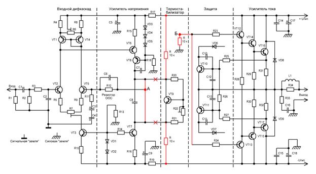Рассмотрим данный алгоритм на примере ремонта гипотетического транзисторного УМЗЧ с биполярными транзисторами в выходных каскадах (рис.1), не слишком примитивного, но и не очень сложного. Такая схема является наиболее распространенной «классикой жанра». Функционально он состоит из следующих блоков и узлов: