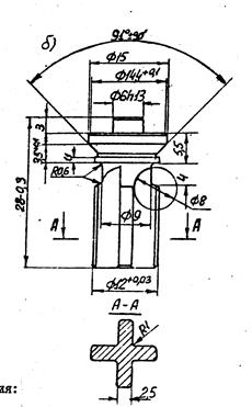 Технические требования: 1. Термообработать: иглу HRC 60-63; корпус HRC 58-62; 2. Матерал: игла – сталь Р18, корпус – сталь 18Х2Н4ВА. Рис.3.20. Детали распылителя форсунки дизеля ЧН 21/21: а – игла; б – корпус.
