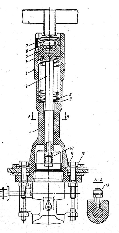 В нижней части картера насоса на трех бронзовых подшипниках 6 с баббитовой заливкой установлен кулачковый вал 4, шесть кулачков которого расположены под углом 60° друг к другу в порядке 1-3-5-6-4-2 (считая со стороны регулятора). Кулачковый вал с помощью толкателей 3 сообщает движение плунжерам насоса в период нагнетания. Толкатель состоит из стального цилиндрического корпуса, ролика 5, установленного на пальце. В хвостик корпуса каждого толкателя ввернут болт для регулирования моментов начала подачи топлива в данный цилиндр дизеля. Обратный ход толкателей обеспечивается пружинами 10, постоянно прижимающими ролики толкателей к поверхностям кулачков вала. В корпусе картера установлен регулятор предельной частоты вращения 7 и привод всережимного регулятора частоты вращения дизеля 8, рукоятка 9 экстренной остановки дизеля. Регулятор предельной частоты вращения размещен на кулачковом валу топливных насосов и отключает топливные насосы, застопорив толкатели в верхнем положении в случае превышения предельно допустимой частоты вращения коленчатого вала дизеля. Привод регулятора частоты вращения дизеля осуществляется от переднего конца кулачкового вала через цилиндрическую и коническую пару шестерен. На передней стенке блока имеются против каждого толкателя кнопки 2, предназначенные для отключения отдельных секций насоса в случае необходимости. Каждая секция насоса соединяется с форсункой трубопроводами высокого давления, имеющими разную длину. Корпус 14 секции топливного насоса предназначен для монтажа в нем всех деталей секции, а также для крепления его на картере насоса. Гильза 11 вставляется сверху до упора ее кольцевого бурта на утолщенной части в кольцевую выточку в корпусе секции, опорные поверхности которых должны быть притерты друг к другу для обеспечения герметичности стыка. В верхней части гильза имеет два окна, расположенных диаметрально противоположно; одно раззенкованное снаружи, является наполнительным, через которое топливо из коллектора поступает в надплунжерную полость, второе, имеющее прямоугольную вертикальную канавку для фиксации положения гильзы стопорным винтом, является отсечным. Снизу на гильзу надета поворотная втулка, свободно поворачивающаяся вокруг гильзы. Поворотная втулка в нижней части имеет две диаметрально расположенные прорези, в которые входят заплечики плунжера. В верхней части плунжер имеет вертикальный паз соединенный с кольцевой выточкой; от вертикального паза берет начало спиральная отсечная кромка, служащая для регулирования количества топлива, подаваемого плунжером. Ниже выточки на плунжере находится уплотнительная кольцевая канавка. Поворот плунжера (для изменения количества подаваемого топлива) осуществляется зубчатой регулирующей рейкой 15, входящей в зацепление с зубьями венца на поворотной втулке плунжера. По вертикальному пазу нижней части поворотной втулки скользят прямоугольные заплечики плунжера, которые заставляют его поворачиваться при повороте втулки. При повороте плунжера на некоторый угол изменится расположение отсечной кромки относительно отсечного окна гильзы. Поворот плунжера по часовой стрелке (если смотреть сверху) увеличивает подачу топлива, а против часовой стрелки - уменьшает. Нa заднем конце рейка имеет срезы и отверстия, позволяющие 
