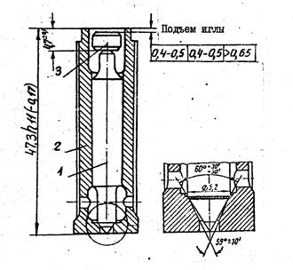 В средней части в корпус запрессованы втулки 16, являющиеся направляющими для толкателей 15. Направляющие втулки 16, застопоренные винтами, имеют на внутренней поверхности продольный паз для фиксации толкателей. Перемещение реек соответственно нагрузке дизеля осуществляется отсечным механизмом, который установлен в игольчатых подшипниках на трех кронштейнах, укрепленных на корпусе насоса. На валике 20 установлены вильчатые рычаги 19, в нижней части которых запрессованы кольца для роликов, входящих в пазы реек; рейка 8 входит в зацепление с поворотной втулкой 11, пружины 22 прижимают рычаги к регулировочным винтам 21. Нам отсечной валик 20 насажан на шпонке трехплечный рычаг в два рычага которого ввернуты болты, ограничивающие положение реек при максимальной и нулевой подачах топлива насосом. При помощи винта 21 можно производить подрегулировку величины подачи топлива по отдельным плунжерным парам. 3.5. Форсунки Форсунки предназначены для впрыскивания топлива в цилиндры дизеля в мелко распыленном виде и равномерного его распределения по всему объему камеры сгорания. Кроме того, форсунка должна иметь минимальные размеры для возможности ее расположения в цилиндровой крышке, а также минимальную массу движущихся частей для обеспечения ее быстродействия и надежности. На тепловозных дизелях применяются форсунки закрытого типа с запорной гидравлически управляемой иглой, у которых нагнетательная полость топливной системы, находящейся под избыточным давлением, в период между впрысками отделена от камеры сгорания иглой, которая прижимается к корпусу распылителя (соплового наконечника) усилием пружины (см. рис.2.1). Уплотнение распылителя в нижней части обеспечивается коническим подвижным соединением. Уплотнение происходит по узкой (менее 0,5 мм) притирочной фаске, образующейся за счет разности углов конуса иглы и корпуса распылителя в 1°. При такой узкой фаске, получаемой взаимной притиркой контактирующих поверхностей, обеспечивается значительное удельное давление в месте контакта, создаваемое пружиной форсунки. Надежное запирание обеспечивает создание высокого остаточного давления, что позволяет управлять законом впрыскивания. Уплотнение в верхней части распылителя (по направляющей) обеспечивается малой величиной зазора (1-3 мкм) между иглой, совершающей возвратно-поступательные движения, и неподвижным корпусом распылителя. Прецизионное соединение по направляющей части распылителя подвержено изнашиванию и обуславливает возможность зависания иглы. Игла, преграждая топливу путь к распиливающим отверстиям, отрывает его только при подъеме, когда усилие от давления топлива, действующее на нее снизу (на дифференциальную площадку), преодолевает усилие пружины форсунки. То есть начало впрыскивания топлива происходит при определенном давлении, которое требуется для подъема иглы, что создает благоприятные условия для качественного распыливания топлива. Качественное распыливание топлива также обеспечивается малым сечением распиливающих отверстий распылителя соплового наконечника. Малая величина подъема иглы распылителя в пределах 0,4-0,6 мм объясняется необходимостью обеспечить кратковременность процесса впрыскивания (0,003-0,005 с). Однако подъем иглы должен быть достаточным, чтобы обеспечить эффективное проходное сечен
