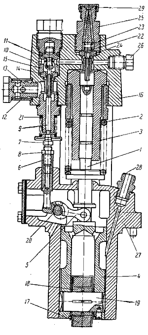 В насосе с регулированием количества подаваемого топлива началом подачи с помощью клапана (см. рис. 1) регулированием винта изменяют момент закрытия перепускного клапана, что обеспечивает изменение момента начала подачи топлива. В насосе плунжерного типа с регулированием количества топлива началом подачи (см. рис. 4) регулированием активного хода плунжера изменяют момент закрытия верхним торцом плунжера отверстия в гильзе, вследствие чего изменяется момент начала подачи топлива.
