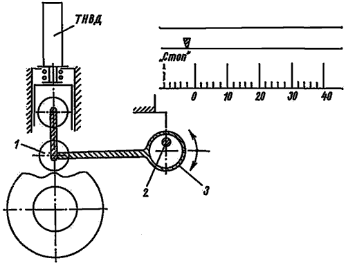 Как видно из рис. 1, сектор «Стоп» шкалы имеет пять делений. Если требуется увеличить или уменьшить производительность насоса, можно совместить риску на корпусе с любой из пяти рисок сектора. При необходимости увеличить производительность следует совместить риску на корпусе с делениями сектора, близкими к нулю, т. е. сделать возможно больший разворот плунжера в сторону увеличения подачи. Снятые индикаторные диаграммы могут показать недостаточное давление в цилиндре при повышенной температуре выпускных газов. Тогда следует увеличить угол опережения подачи топлива. Эта операция легко выполняется на ходу перемещением ролика 1 привода плунжера. Для этого следует повернуть по часовой стрелке эксцентриковый вал 2, наблюдая за шкалой, нанесенной на бугеле 3. Между делениями 0 и 45° перемещение вала на 7° увеличивает давление в цилиндре на 0,1 МПа. После отметки 45° повышение давления на 0,1 МПа требует поворота более чем на 7°, так как вал приближается к своему крайнему положению. Date: 2015-07-01; view: 2945; Нарушение авторских прав |