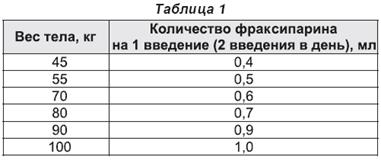 В настоящее время основным препаратом для лечения ТЭЛА является гепарин (как нефракционированный, так и низкомолекулярный). Он подавляет рост тромбов, способствует их растворению и предупреждает тромбообразование. Кроме того, оказывает антисеротониновое и антибрадикининовое действие, благодаря чему играет важную роль в устранении сосудо- и бронхосуживающих эффектов. Первоначально вводится 10–20 тыс. ЕД гепарина внутривенно струйно, затем — 5000 ЕД каждые 4 часа. Эффективнее применять высокие дозы гепарина: внутривенно струйно 20 000 ЕД (300–500 ЕД/кг) с последующей инфузией 5000 ЕД/ч. Контроль за гепаринотерапией: АЧТВ (достижение несвертываемости в течение более 100 с) 4 раза в сутки. Затем постепенное снижение дозы на 500–1000 ЕД/ч. Суточная доза должна составлять 30 000–60 000 ЕД. Продолжительность курса 5–7 дней, поскольку в эти сроки происходят лизис и организация тромба. За 3 дня до отмены гепарина назначают непрямые антикоагулянты (фенилин, варфарин), так как они вначале снижают уровень протеина С, что может вызвать тромбозы. Продолжительность лечения непрямыми антикоагулянтами должна составлять не менее 3 месяцев. В последние годы с успехом используются низкомолекулярные гепарины (НМГ) - фраксипарин, клексан, фрагмин. Положительными моментами в использовании НМГ являются высокая биодоступность, быстрое всасывание при подкожной инъекции, небольшая кратность введения — 1–2 раза в сутки, хорошая переносимость, редкое развитие осложнений.. С лечебной целью фраксипарин вводится 2 раза в сутки с интервалом 12 часов в следующих дозах в зависимости от массы тела больного (табл. 1).