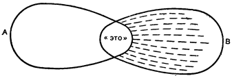 Небольшая группа элементов «это», общая двум системам А и В, может оказать решающее действие или в пользу А, или в пользу В в зависимости от слу- чайного перевеса в ту или другую сторону (рис. 15). Ес- ли в каком-нибудь пункте путь от «этого» к В на мгно- вение оказался более доступным для нервного тока, чем путь от «этого» к А, то равновесие нарушается в поль- зу целой системы В. Токи проникнут через пункт наи- меньшего сопротивления и распространятся по всем пу- тям В, делая образование А все менее и менее воз- можным. В таком случае мысли, соотносительные с А и с В, будут иметь различные объекты, хотя и сход- ные между собой. Впрочем, сходство будет заключаться в какой-нибудь весьма незначительной черте, если об- ласть «этого» очень мала. Таким образом, самые сла- бые ощущения могут повлечь за собой восприятие вполне определенных объектов, если только эти ощуще- ния сходны именно с теми, в которых восприятие дан- ных объектов нуждается для своего возникновения.