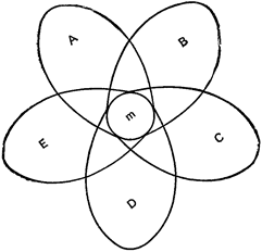 Описанный нами процесс изображен схематически на рис. 18. Если т в данном представлении А вызывает в нашем уме В, С, D и Е, которые сходны с Л в том, что обладают все свойством от, и притом вызывает их в бы- строй последовательности одно за другим, то т, ассоции- руясь почти одновременно со столь различными окру- жающими условиями, выделится из среды и обратит на себя наше особое внимание.