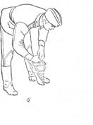 Рис. 19. Выполнение приема «положить оружие»: а, б, в — последовательность выполнения Разучивание выполнения приема «в ружье» по разделениям производится на три счета. По счету «делай — РАЗ» сделать левой ногой шаг вперед и, нагибаясь, взять оружие в правую руку, при этом правая нога должна быть прямой. По счету «делай — ДВА» выпрямиться и приставить левую ногу к правой, оружие держать в правой руке; у пулеметов складываются сошки. По счету «делай — ТРИ» взять оружие в положение «на ремень» и принять строевую стойку.