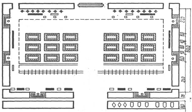 Строевой плац воинской части (военно-учебного заведения) должен обеспечивать проведение: — занятий по строевой подготовке; — занятий по подготовке личного состава к параду и проведение тренировок с подразделениями, назначенными в почетные караулы; — состязаний на лучшее подразделение по строевой подготовке; — утренней физической зарядки; — общих батальонных и полковых вечерних поверок; — развода караула, проверки команд, наряжаемых от части, а также личного состава, увольняемого из расположения части, — митингов, ритуалов приема прибывшего пополнения вручения оружия, принятия присяги, выпуска из военно-учебного заведения и других воинских ритуалов; — построения личного состава перед выходом на занятия. Место расположения строевого плаца определяется при разработке генерального плана военного городка. Для проведения занятий по одиночной строевой подготовке вся площадь плаца (рис. 36) разбивается на строевые площадки. Такие площадки позволяют более качественно отрабатывать многие строевые приемы: строевой шаг, повороты на месте и в движении, подход к начальнику и отход от него и т. д. Строевая площадка (рис. 37) имеет размеры 8Х Х16 м и рассчитана на проведение занятий в составе отделения. Строевые площадки располагаются равномерно по всей площади плаца. Кроме строевых площадок на плацу выделяется полоса для прохождения подразделений торжественным маршем. Линия прохождения правофланговых располагается на расстоянии 5—8 м от трибуны, в одном шаге от нее обозначаются места для линейных в 10—15 м (15— 20 шагах) друг от друга. Все линии на плацах с асфальтовым покрытием наносятся белой краской. Если покрытие плаца из песчано-гравийной смеси, то все линии наносятся разведенной известью или выкладываются цветным камнем. В тех случаях, когда в районе территории плаца па проекту теплоснабжения должна быть теплотрасса, желательно ее проложить, для подтаивания снега в зимнее время, под полосой прохождения подразделений торжественным маршем. На строевом плацу устанавливаются стенды, на которых должны быть пособия, плакаты, рисунки из Строевого устава, выписки с рисунками из правил ношения военной формы одежды (рис. 30). Каждый строевой плац должен быть хорошо освещен и радиофицирован. Вдоль плаца устанавливаются флагштоки, приспособления для установки зеркал, электрифицированные часы, приспособления для чистки обуви, скамейки для отдыха во время перерыва занятий, гидранты для промывки плаца. Озеленение плаца разрабатывается одновременно с проектом озеленения всего военного городка. Рядом с плацем оборудуются места и площадки для отработки способов передвижения на поле боя и действий личного состава на машинах. Покрытие плацев должно осуществляться с учетом гидрометеорологических условий каждой климатической зоны. При этом учитываются все особенности их эксплуатации. В соответствии с назначением плацев их покрытия должны быть достаточно гладкими и прочными, допускать мойку и нанесение на поверхность необходимых разметок. Основным типом покрытия плацев, отвечающим УСЛОВИЯМ эксплуатации, является асфальтовое покрытие. В отдельных случаях при необходимости могут применяться и другие типы покрытий, как, например, цементо-бетон, сборные железобетонные и бетонные плиты, песчано (грунто)-гравийное покрытие. При планировке