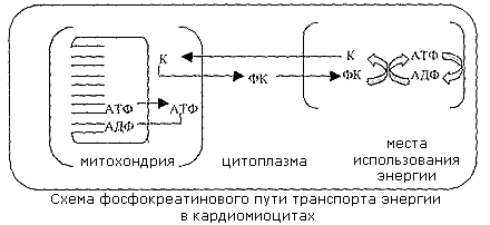 Анаэробная зона энергообеспечения: АДФ + Фосфат + свободная энергия <=> АТФ Фосфокреатин + АДФ <=> креатин + АТФ 2 АДФ <=> АМФ + АТФ Гликоген (глюкоза) + Фосфат + АДФ <=> лактат + АТФ Аэробная зона энергообеспечения: Гликоген (глюкоза), жирные кислоты + Фосфат +О2С02 + Н2 0 + АТФ Источники энергии — это фосфагены, глюкоза, гликоген, свободные жирные кислоты, кислород. Введение АТФ извне в достаточных дозах невозможно (обратное является широко распространенным заблуждением), следовательно, необходимо создать условия для образования повышенного количества эндогенного АТФ. На это направлена тренировка - сдвиг метаболических процессов в сторону образования АТФ, а также обеспечение ингредиентами. Скорость накопления и расхода энергии значительно различаются в зависимости от функционального состояния спортсмена и вида спорта. Определенный вклад в процесс энергообеспечения, его коррекцию, возможен со стороны фармакологии. В начале 70-х годов было доказано, что сокращение ишемизированного миокарда прекращается при исчерпании клеточных запасов фосфокреатина (ФК), несмотря на то, что в клетках остается неизрасходованным около 90% АТФ. Эти данные говорят о том, что АТФ неравномерно распределена внутри клетки. Доступным является не весь АТФ, содержащийся в мышечной клетке, а лишь его небольшая часть, локализованная в миофибриллах. Результаты исследований, выполненных в последующие годы, показали, что связь между внутриклеточными пулами АТФ осуществляют ФК и изоферменты креатинкиназы. В нормальных условиях молекула АТФ, выведенная из митохондрии, передает свою энергию креатину, который под воздействием митохондриального изофермента креатинкиназы трансформируется в ФК. Последний мигрирует к местам локальных креатинки-назных реакций (сарколемма, миофибриллы, саркоплазматический ретикулум), где другие изоферменты креатинкиназы обеспечивают ресинтез АТФ из ФК и АДФ. Освобождающийся при этом креатин возвращается в митохондрию, а энергия АТФ используется по назначению, в том числе и для мышечного сокращения (см. схему). Скорость транспорта энергии внутри клетки по фосфокреатиновому пути значительно превосходит скорость диффузии АТФ в цитоплазме. Именно поэтому снижение содержания ФК в клетке и приводит к депрессии сократимости даже при сохранении значительного внутриклеточного запаса основного энергетического субстрата - АТФ. По современным представлениям, физиологическая роль ФК состоит в эффективном обеспечении внутриклеточного транспорта энергии от мест ее производства к местам использования. В аэробных условиях основными субстратами для синтеза АТФ являются свободные жирные кислоты, глюкоза и лактат, метаболизм которых в норме обеспечивает продукцию около 90% общего количества АТФ. В результате ряда последовательных каталитических реакций из субстратов образуется ацетил-коэнзим А. Внутри митохондрий в ходе цикла трикарбоновых кислот (цикла Кребса) происходит расщепление ацетил-коэнзима А до углекислоты и атомов водорода. Последние переносятся на цепь транспорта электронов (дыхательную цепь) и используются для восстановления молекулярного кислорода до воды. Энергия, образующаяся при переносе электронов по дыхательной цепи, в результате окислительного фосфорилирования трансформируется в энергию АТФ. Уменьшение доставки к