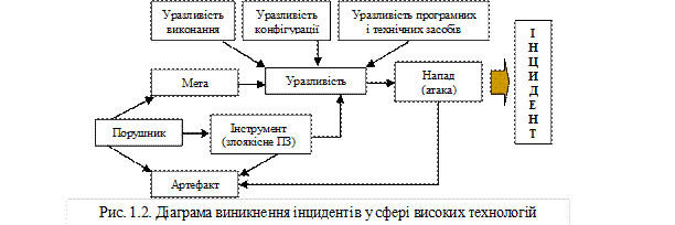 Характерними ознаками, які нині уособлюють поняття кібербезпеки (стану захищеності кіберпростору держави в цілому або окремих об’єктів його інфраструктури /ІКС, спеціальних ІКС тощо/ від ризику стороннього кібервпливу, за якого забезпечується їх сталий розвиток, а також своєчасне виявлення, запобігання й нейтралізація реальних і потенційних викликів, кібернетичних втручань і загроз особистим, корпоративним та/або національним інтересам) – є сукупність активних захисних і розвідувальних дій, що в процесі інформаційного протиборства зусиллями поодиноких інсайдерів або організованих кіберугруповань розгортаються навколо ІР, ІКТ і ІТС та які спрямовані на досягнення і утримання потенційними протиборчими сторонами переваги у протидії новим загрозам безпеці для власних об’єктів критично важливої інформаційної (кібер) інфраструктури. Нині, з метою уникнення багатозначності у трактуванні термінів кібервтручання (фактично неприховані спроби впливу протиборчих сторін на інформаційний і кіберпростори один одного за рахунок використання засобів сучасної обчислювальної та/або спеціальної техніки й відповідного програмного забезпечення) і кіберзагрози (прояви дестабілізуючого негативного впливу на певний об’єкт, що реалізуються за рахунок використання технологічних можливостей інформаційного і кіберпросторів, створюючи при цьому небезпеку як для них самих, так й для свідомості людини у цілому), інструктивні матеріали Інтерполу рекомендують поділяти деструктивні інциденти у сфері високих технологій під якими розумітимемо порушення встановленого рівня їх безпеки (рис. 1.2) на такі основні групи: власне комп’ютерні інциденти, що полягають, наприклад, у втручанні в роботу обчислювальних систем, порушенні авторських прав на програмне забезпечення, а також розкраданні даних і комп’ютерного часу тощо; мережеві інциденти, що сприяють здійсненню незаконних угод. інциденти “пов’язані з комп’ютерами”, що супроводжують головним чином протиправні дії за напрямом фінансового шахрайства.