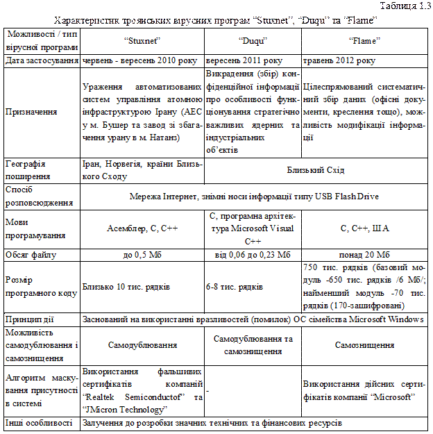 Прикладами такому є: 1) події червня 1982 року, коли шляхом активації програмного забезпечення, отриманого радянськими розвідниками в Канаді, та у яке, як з’ясувалось пізніше, американці попередньо ввели помилкові дані, була проведена кібератака проти сибірського газопроводу. Після одержання команди ззовні програма перевищила режим роботи газопроводу настільки, що він вибухнув; 2) події 1995 року, коли з банку “Україна” шляхом проникнення в його мережу було викрадено майже 4 мільйони доларів, 1997 року, коли на декілька годин була заблокована робота Internet-провайдера “Глобал Юкрейн”, 2000 року, коли була зафіксована інформаційна диверсія проти Internet-провайдера “ukr.net”, лютого 2012 року, пов’язані з масованим кібернападом на державні ІР в ході виборчої кампанії в Україні; 3) міждержавні інциденти 2010 року, спричинені мережевими черв’яками Duqu, Flame та Stuxnet (таблиця 1.3). Останній був розроблений групою фахівців з Ізраїлю і США за участю представників Німеччини та Великобританії. Наслідком його деструктивних дій стало гальмування ядерної програми Ірану. Цьому сприяло виявлення вірусом програмованих логічних контролерів (ПЛК) у автоматизованій системі управління технологічними процесами станції (Supervisory Control And Data Acquisition), а також можливість використання (для впровадження особливого коду у “залізо” ПЕОМ АЕС) чотирьох, невідомих раніше уразливостей “нульової доби” (“ zero-day ”) у діючих версіях ОС Windows та двох дійсних сертифікатів від компаній Realtek і JMicron. Саме наявність останніх надавала можливість Win32 / Stuxnet тривалий час уникати антивірусних радарів. У ході детального вивчення Win32 / Stuxnet фахівці “Лабораторії Касперського” прийшли до невтішного висновку, що поява цієї шкідливої програми фактично знаменувала собою початок нової ери – ери кібервійни. За висловлюванням Є. Касперського – співзасновника і генерального директора “Лабораторії Касперського”, цей програмний засіб призначений не стільки “… для крадіжки грошей, розсилання спама або знищення особистих даних …”, скільки створений для “… виведення з ладу заводів та ушкодження промислових систем …”.