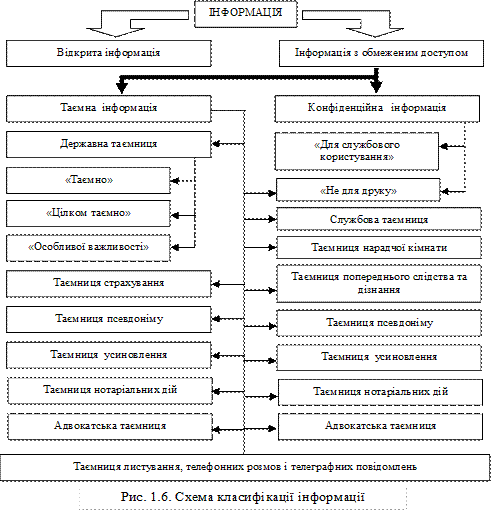 є придатним для колективного використання (на відміну від інших ресурсів); у процесі споживання не втрачає своїх якостей. У теорії автоматизованого оброблення інформації її розглядають як сукупність знань, що є об’єктом накопичення, реєстрації, передачі, збереження та оброблення. В економічному комплексі функціонують науково-технічна, економічна, правова, адміністративна, та інші види інформації. Першим законодавчим актом, що стверджує інформаційний суверенітет України закріплює право громадян на інформацію закладає правові основи інформаційної діяльності і визначає правові форми міжнародного співробітництва в галузі інформації, став Закон України “Про інформацію”, прийнятий Верховною Радою України 02 жовтня 1992 року. Згідно статті 18 Закону інформація класифікується на: статистичну і масову інформацію, інформацію про діяльність державних органів влади й органів місцевого і регіонального самоврядування, правову інформацію та інформацію про особу, інформацію довідково-енциклопедичного характеру та соціологічну інформацію. Слід зазначити, що за будь-яких умов класифікацію інформації слід починати з виділення двох основних її класів – відкритої інформації та інформації з обмеженим доступом, тобто (рис. 1.6):