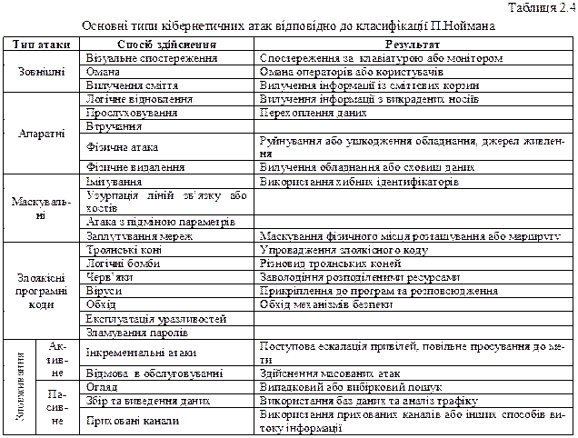 пасивний вплив (користувач прослуховує лінії зв’язку між двома вузлами мережі тощо); 4) за способом впливу на об’єкт атаки, зокрема на систему дозволів (захоплення привілеїв), а також безпосередній доступ до даних, програм, служб, каналів зв’язку з використанням привілеїв; 5) за засобами впливу на об’єкт атаки, що передбачають використання або стандартного ПЗ, або спеціально розроблених програм; 6) за об’єктом атаки: напад може здійснюватися саме на систему в цілому; на дані і програми, що знаходяться на зовнішніх (дисководи, мережеві пристрої, термінали) або внутрішніх (оперативна пам’ять, процесор) пристроях системи, а також у каналах передачі даних; на процеси і підпроцеси системи за участю користувачів. Метою таких атак є або прямий вплив на роботу процесу (його припинення, зміна привілеїв і характеристик), або зворотний вплив (використання зловмисником привілеїв, характеристик тощо іншого процесу у своїх цілях); 7) за станом об’єкта: безпосередньо під час атаки інформація в ньому може зберігатися, передаватися або оброблятися. Наприклад, у ході передавання інформації лініями зв’язку між вузлами мережі або всередині вузла можливий доступ до фрагментів переданої інформації шляхом перехоплення пакетів на ретрансляторі мережі, або ж прослуховування з використанням прихованих каналів; 8) за використовуваною системою захисту, за кількістю атакуючих, за джерелами атак, за розміщенням атакуючого об’єкта відносно до атакованого, за наявністю зв’язку з атакованим об’єктом, за рівнем еталонної моделі OSI об’єкта, на який здійснюється вплив тощо. При цьому помилки системи захисту інформації (СЗІ) можуть бути зумовлені, наприклад, помилками адміністративного управління, помилками в алгоритмах програм, а також у зв’язках між ними, помилками кодування тощо. Зважаючи на те, що нині переважну кількість кібератак на практиці не застосовують, більш життєздатною вважається класифікація, запропонована П.Нойманом, який пропонує сконцентрувати увагу на двадцяти шести основних типах таких дій (табл. 2.4), які можуть бути спрямованими проти ІТС спецпризначення. Найбільш розповсюдженими способами їх здійснення є mailbombing, sniffer пакетів та IP-спуфінг, DoS і DDoS атаки, парольні атаки, атаки типу Man-in-the-Middle та/або Side Channel Attack, атаки на рівні додатків типу логічних бомб і троянських коней, вірусні атаки, атаки з використанням мережевих черв’яків та так звані Ін’єкції.