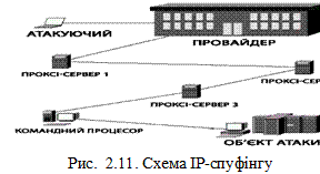 Наприклад, mailbombing, як спосіб здійснення кібератаки, за розумінням П. Ноймана та інших фахівців полягає в бомбардуванні ПК протиборчої сторони електронною поштою. Сьогодні mailbombing практично не використовується. Сніфер пакетів – програма, яка використовує мережевий інтерфейс є у так званому нерозбірливому (promiscuous mode) режимі, перехоплює мережевий трафік, призначений для інших вузлів, та здійснює його подальший аналіз. Результати застосування дають можливість виявити паразитний, вірусний і закільцьований трафік; виявити в мережі шкідливе і несанкціоноване ПЗ (мережеві сканери, флудери, троянські програми тощо); перехопити будь-який, призначений для користувача, незашифрований, а деколи і зашифрований трафік з метою отримання паролів та іншої інформації; локалізувати несправність мережі або помилку конфігурації мережевих агентів). Для зниження загрози сніффінгу пакетів потрібно вживати таких заходів: застосовувати такі методи аутентифікації, як однократні паролі типу One-Time Passwords (ОТР) та DTP. В інших випадках, наприклад, у разі перехоплення електронної пошти зазначені методи не ефективні; створити комутуючу інфраструктуру (у разі використання комутуючого Ethernet протоколу це дозволить хакерам отримати доступ лише до трафіка, що поступає на порт, до якого вони підключені); встановити антисніфери або ПЗ, що розпізнають сніфер пакетів, функціонуючий у визначеній мережі (антисніфери вимірюють час реагування хостів і визначають, чи не доводиться хостам обробляти зайвий трафік); створити систему криптозахисту. Це найбільш ефективний спосіб боротьби зі sniffer пакетів. Якщо канал зв’язку є криптографічно захищеним, то хакер перехоплює не повідомлення, а зашифрований текст. IP-спуфінг (spoof –обман, містифікація, підроблення) – вид хакерської атаки (рис. 2.11) з якою використання чужої IP-адреси, тобто введення в оману системи безпеки або приховування реальної адреси атакуючого для того, щоб відправити/надіслати відповідний пакет на потрібну адресу чи атакованого (зловмисник, який перебуває всередині корпорації/установи або поза нею, видає себе за санкціонованого користувача).