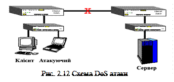 Часто використовується як складова частина комплексної атаки. Типовий приклад – DDoS атака, для здійснення якої хакер розміщує відповідну програму за чужою IP-адресою, щоб приховати власну. Послабити загрозу IP-спуфінгу, а кібератаку зробити абсолютно неефективною можна завдяки: застосування фільтрації RFC 2827 (передбачає заборону будь-якого трафіка, вихідна адреса якого не є однією з ІР-адрес певної установи); правильному настроюванню управління доступом (передбачає заборону будь-якого трафіка, що надходить із зовнішньої мережі з вихідною адресою, яка має перебувати всередині власної мережі); упровадженню додаткових заходів аутентифікації, а саме створенню системи криптографічного захисту. Разом з тим слід зазначити, що на цей час розроблено велику кількість автоматизованих систем захисту, які взагалі роблять IP-спуфінг неефективним. Відмова в обслуговуванні (Denial of Service – DoS) – атака на комп’ютерну систему з метою зробити комп’ютерні ресурси/мережу недоступними для користувачів внаслідок перевищення припустимих меж функціонування мережі, операційної системи або додатка; підвищення витрат ресурсів процесор та зме- ншення пропускної можливості каналу зв’язку (рис. 2.12).