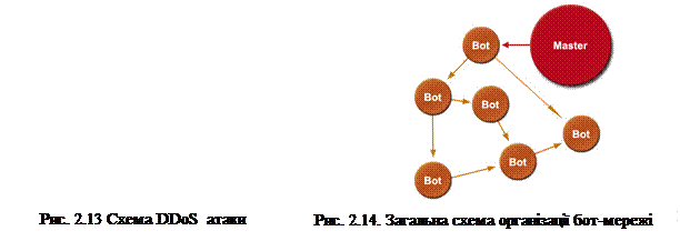 Найвідомішими різновидами DoS атак є такі: Flood, ICMP flood, Identification flood, TCP SYN flood, Ping of Death, Tribe Flood Network, Trinco, Stacheldracht, Trinity та багато інших. Серед них лише атаку TCP SYN flood, що полягає у надсиланні великої кількості запитів на ініціалізацію TCP -з’єднань з вузлом-мішенню, якому в результаті доводиться витрачати всі свої ресурси на те, щоб відстежувувати ці частково відкриті з’єднання, – фахівці відзначають найбільш ефективною. Вона є найвідомішим способом переповнення інформаційного каналу SYN -пакетами, внаслідок якого сервер не відповідає на запити користувачів. Під час Flood (“затоплення”) та ICMP flood (flood ping – “потік пінгів”) атак на систему надсилається відповідно велика кількість ICMP (найчастіше) або UDP -пакетів, які не несуть корисної інформації та так званих ехо-запитів ICMP (пінг системи). У результаті відбувається зменшення перепускної смуги каналу, незначне завантаження комп’ютерної системи аналізом “сміття”, що надійшло, та генерацією на нього відповідей (довідково: ICMP -пакети не аналізуються системою за умовчанням, а відповіді на них не займають багато CPU-time). Атака Identification flood (запит ідентифікації системи) дуже схожа на ICMP flood. Відрізняється від неї тільки тим, що додатковою умовою її проведення є запит інформації про комп’ютерну систему (TCP порт 113). Зважаючи на те, що аналіз цих запитів і генерування на них відповідей потребують більше процесорного часу, ніж при пінгах, така атака вважається більш ефективною. Результатом атаки Ping Of Death є зависання ОС системи, включаючи мишу й клавіатуру. Це, як правило, є відповіддю системи на надходження сильно фрагментованого ICMP пакету великого обсягу (64Kb). На даний час майже не використовується. UDP flood (User Datagram Protocol) та TCP flood атаки полягають у відправленні на адресу системи-мішені безлічі пакетів UDP та TCP, що призводить до “зв’язування” мережевих ресурсів. На сьогодні вони вважаються найменш небезпечними. Це пояснюється їх легким виявленням зважаючи на застосування при обміні пакетами головного контролера й агентів нешифрованих протоколів TCP і UDP. Загрозу DoS атак можна послабити у результаті: правильної конфігурації на маршрутизаторах і міжмережевих екранах функцій антиспуфінга (впровадження фільтрації RFC 2827) та функцій антиDoS; обмеження обсягу некритичного трафіка (non-critical traffic – визначає імовірність того, що мережа зв’язку відповідає заданому та узгодженому трафіку), що проходить мережею. Типовим прикладом такого є обмеження обсягів трафіка ICMP, що використовується тільки для діагностичних цілей. Розподілена DDoS атака (Distributed Denial of Service) – це підтип DoS атаки, що здійснюється одночасно з великої кількості IP-адрес (комп’ютерів) на систему об’єкта атаки та має за мету зробити мережу недоступною для звичайного використання (рис. 2.13). Для цього створюються так звані ботнети (інакше бот-мережі або зомбі-мережі) із групи заражених шкідливими програмами комп’ютерів, які одночасно надсилають запити до ресурсу, що атакується (рис. 2.14). У результаті сервер не справляється з навантаженням, і доступ до атакованого ресурсу ускладнюється або взагалі стає неможливим. Вартість атаки з використанням ботнетів, що налічує 10–20 тисяч комп’ютерів, становить нині (у разі потреби “завалити”, наприклад, портал новин) від 100–150 до 1000 доларів за добу. Збиток від такої атаки становить згідно з останніми даними приблизно 10 000 до
