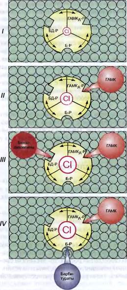 Рис. 7.1. Принцип ГАМК-миметического действия бензодиазепинов и барбитуратов. Представлена условная схема ГАМКд-бензодиа-зепин-барбитуратного рецепторного комплекса с ионофором хлора. I - состояние покоя; II - повышение проводимости хлорных каналов под влиянием ГАМК. Бен-зодиазепины (III) и барбитураты (IV) алло-стери-чески усиливают действие ГАМК. Увеличивается поступление ионов хлора внутрь нейрона, что усиливает тормозной эффект. ГАМКД-Р - ГАМКд-ре-цептор; БД-Р - бензодиазепиновый рецептор; Б-Р - барбитуратный рецептор. эмакология 1 Для ориентировки приведены цифры, отражающие «период полужизни» препаратов (t,/2). ется поступление ионов хлора внутрь нейронов, что приводит к увеличению тормозного постсинаптического потенциала. Применяемые бензодиазепины различаются главным образом по фарма-кокинетике. Часть из них подвергается биотрансформации с образованием активных длительно действующих метаболитов (флуразепам, диазепам и др.). У таких препаратов общая продолжительность действия складывается из длительности эффектов как исходного вещества, так и его метаболитов. Ряд бензодиазепинов не образуют активных метаболитов либо они быстро инактивируются (лоразепам, те-мазепам и др.). Препараты этого типа предпочтительнее в качестве снотворных средств, так как последействие у них выражено в меньшей степени. По продолжительности психосе-дативного действия производные бен-зодиазепина могут быть представлены следующими группами1. 1. Препараты средней продолжительности действия. A (t1/2 = 12—18 ч): лоразепам (ати-ван), нозепам (оксазепам, тазепам), темазепам (рестроил). В (t,/2 «24 ч): нитразепам (раде-дорм, эуноктин). 2. Препараты длительного действия (t|/2 = 30—40 ч и более): фена-зепам, флуразепам (далман), диазепам (сибазон, седуксен). Все приведенные бензодиазепины вызывают сон продолжительностью 6—8 ч. Однако чем длительнее действие препарата, тем больше вероятность последействия, которое проявляется в течение дня в виде седативного эффекта, замедления двигательных реакций, нарушений памяти. При повторных назначениях происходит кумуляция препаратов, которая находится в прямой зависимости от длительности их действия. Глава 7 <> Снотворные средства < 187 Таблица 7.1. Сравнительная оценка золпидема и зопиклона