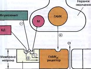Аллостерический участок Рис. 11.3. Локализация действия модуляторов ГАМКд-рецепторов и их антагониста флумазе-нила. БД - бензодиазепиновое соединение с ГАМК-миметической активностью; М - эндогенный модулятор (типа DBI: Diazepam binding inhibitor - ингибитор связывания диазепама). Плюс - стимулирующее (активирующее) действие, минус - угнетающее. препараты иногда обозначают как «дневные анксиолитики (транквилизаторы)». К их числу может быть отнесен мезапам (рудотель). Бензодиазепины вызывают миорелаксацию, причиной которой являются угнетение спинальных полисинаптических рефлексов и нарушение их супраспи-нальной регуляции (такие вещества относят к числу центральных миорелаксан-тов). Бензодиазепины обладают противосудорожной активностью. В больших дозах могут вызывать амнезию. Потенцируют угнетающее влияние на ЦНС веществ с наркотическим типом действия. На вегетативную иннервацию они не влияют (м-холиноблокирующие, ганглиоблокирующие и адреноблокирующие свойства у них отсутствуют). Артериальное давление в обычных терапевтических дозах не изменяют. Являясь липофильными соединениями, бензодиазепины легко проникают через гематоэнцефалический и другие биологические барьеры. Хорошо всасываются из пищеварительного тракта, в основном из двенадцатиперстной кишки. Быстрее всего абсорбируется диазепам, более медленно — нозепам, лоразепам; промежуточное положение занимают альпразолам, мидазолам. В организме бензодиазепины подвергаются биотрансформации. Некоторые метаболиты обладают выраженным и продолжительным анксиолитическим эффектом (схема 11.2). В качестве примера может быть назван метаболит хлордиазе-поксида и диазепама — N-дезметилдиазепам (нордиазепам), снижение содержания которого в плазме на 50% (t1/2) происходит в диапазоне 40—200 ч (табл. 11.3). Большая часть бензодиазепинов и их метаболитов связывается с белками плазмы (70—90%). Кроме того, за счет липофильности значительные количества препаратов депонируются в жировой ткани. 248 ❖ ФАРМАКОЛОГИЯ ❖ Частная фармакология Хлордиазепоксид" Дезметил-"хлордиазепоксид' N-деалки-лирование Демоксепам*' 3-гидрокси-лирование I Ф1 Л< Диазепам" Флуразепам* ■ N-гидроксиэтил-~*"флуразепам* N-дезметил-диазепам*** — (нордиазепам) N-дезалкил-флуразепам*' ■ Оксазепам**— И 3-гидрокси-флуразепам"* оразепам □ Мидазолам* ^а-Гидрокси-мидазолам*