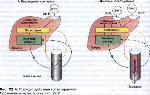 Глава 22 - Средства, применяемые при гиперлипопротеинемии.... 511 ' От англ. sequestrate — удалять. Ловастатин, симвастатин и флувастатин примерно в 2 раза больше связываются с белками плазмы крови, чем правастатин. Выделяются все препараты в основном с желчью через пищеварительный тракт. Назначают препараты внутрь 1 раз в сутки перед сном. Если их комбинируют с препаратами типа холестирамина, то принимают за 1 ч до или через 4 ч после приема холестирамина. Это связано с тем, что последний нарушает абсорбцию статинов. Побочные эффекты приведенных статинов аналогичны таковым для ловастатина. Созданы вещества, ингибирующие всасывание холестерина в кишечнике. Первым препаратом такого типа является эзетимиб. Химически — это производное 2-азетидинона. Механизм действия его заключается в ингибировании транспортера холестерина в энтероцитах кишечника. Это приводит к снижению всасывания холестерина примерно на 50%. При этом содержание холестерина в хило-микронах и их осколках, утилизируемых печенью, понижается. Падает также содержание холестерина за счет ЛПНП и ЛПОНП (на 20—25%). Одновременно повышается экспрессия ЛПНП-рецепторов печени, что увеличивает клиренс Л ПНП. Содержание ЛПВП незначительно повышается. В итоге развивается гиполипидемия. Эзетимиб хорошо всасывается из кишечника. В энтероцитах большая часть его превращается в глюкуронид, который по ингибирующей активности в отношении транспортера холестерина равноценен эзетимибу. Оба соединения в основном содержатся в энтероцитах. В плазму циркулирующей крови попадают в небольших количествах. Из венозной крови они захватываются печенью и затем выводятся с желчью в кишечник, откуда вновь всасываются. Возникает кишеч-но-печеночная рециркуляция, обеспечивающая длительное действие эзетимиба и его метаболита (tl/2 ~ 22 ч). Выделяется эзетимиб в основном кишечником, а его глюкуронид — почками. Назначают эзетимиб 1 раз в сутки. Максимальное действие развивается через 2 недели. Из побочных эффектов возможны боли в области живота, диарея, головная боль, аллергические реакции. Эзетимиб и его глюкуронид не влияют на систему Р-450 и поэтому мало взаимодействуют с другими лекарственными средствами. Всасывание жирорастворимых витаминов не нарушается. Эзетимиб часто комбинируют со статинами. Иной принцип гиполипидемического действия характерен для холестирамина. Это хлорид основной анионообменной смолы, содержащей четвертичные аммониевые группировки. Из желудочно-кишечного тракта не всасывается, пищеварительными ферментами не разрушается. Связывает в кишечнике желчные кислоты (за счет четвертичных аммониевых группировок). Образовавшийся комплекс выводится с экскрементами (рис. 22.4; 22.5). Поэтому вещества такого типа часто называют секвестрантами1 желчных кислот. При этом всасывание из кишечника холестерина понижается. Уменьшение абсорбции желчных кислот (на 85-90%) и холестерина сопровождается компенсаторным увеличением синтеза холестерина в печени. Однако в плазме крови содержание холестерина снижается, так как его выведение преобладает над синтезом. В ответ на понижение уровня холестерина в плазме и тканях для повышения его биосинтеза в печени образуются новые ЛПНП-рецепторы. Они способствуют еще более интенсивному 512 ❖ ФАРМАКОЛОГИЯ О Частная фармакология