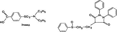 Сульфинпиразон Пробенецид Этамид Бензбромарон Q — угнетающий эффект Рис. 25.1. Принципы выведения мочевой кислоты почками и локализация действия урикоз-ури-ческих средств (дана схема нефрона). 1 - фильтрация: 2, 4 - реабсорбция; 3 - секреция. канальцах — практически полная реабсорбция. Второй этап заключается в секреции мочевой кислоты в проксимальных канальцах и ее последующей повторной активной реабсорбции (~ 80%). К числу средств, применяемых при лечении подагры, относятся препараты, уменьшающие содержание мочевой кислоты в крови, а также противовоспалительные средства. Уменьшить содержание мочевой кислоты в плазме крови можно двумя путями: 1) повышением выведения мочевой кислоты из организма; 2) угнетением образования мочевой кислоты. Препараты, способствующие выведению мочевой кислоты, называют урикозурическими средствами. К ним относятся антуран, этамид, пробенецид, бензбромарон (рис. 25.1). Их применяют для профилактики приступов подагры. Сульфинпиразон (антуран) является производным пиразолона (сходен по структуре с бутадионом). В больших дозах угнетает реабсорб-цию мочевой кислоты в прокси- мальных почечных канальцах, что повышает ее выведение с мочой. В малых дозах снижает секрецию мочевой кислоты, задерживая ее в организме. Уменьшает также выведение (секрецию) почками бензилпенициллина. Как уже отмечалось ранее, сульфинпиразон снижает агрегацию тромбоцитов (см. главу 19; 19,1). Хорошо всасывается из желудочно-кишечного тракта. Продолжительность действия около 10 ч. Препарат и его метаболиты выделяются почками. Из побочных эффектов наиболее характерно раздражающее действие на слизистую оболочку пищеварительного тракта (поэтому препарат следует принимать с пищей), возможны аллергические реакции, образование камней в мочевыводя-щих путях, редко — угнетение кроветворения. Аналогичным механизмом урикозурического действия обладают пробенецид и этамид. Кроме того, оба препарата, как и антуран, уменьшают выведение бензилпенициллина и ряда других веществ, выделяющихся в почечные канальцы путем секреции. Пробенецид является производным бензойной кислоты. Он хорошо всасывается при энтеральном введении. Максимальная концентрация в плазме накапливается в среднем через 3 ч. Действует продолжительно (t,/2 = 8—10 ч). Большая часть препарата связывается с белками плазмы. Выделяется он почками, преимущественно путем секреции. Пробенецид может вызывать раздражение слизистой Глава 25 <■ Противоподагрические средства ■■> 527 оболочки пищеварительного тракта, кожные аллергические реакции, образование камней в почках. Этамид также относится к числу производных бензойной кислоты. Сходен по структуре с пробенецидом. Хорошо всасывается из кишечника. Переносится хорошо. Возможны диспепсические нарушения, выпадение в моче уратов и образование конкрементов. Эффективным урикозурическим средством является бензбромарон (норму-рат, хипурик). Он угнетает реабсорбцию мочевой кислоты в проксимальных канальцах. Кроме того, ингибирует синтез пуриновых оснований и уменьшает всасывание мочевой кислоты в кишечнике. Полностью всасывается из пищеварительного тракта. Переносится хорошо. У части пациентов развиваются диарея и зудящая кожная сыпь. В качестве противоподагрического средства иногда используют уродан. Считают, что компоненты этого с