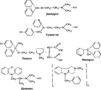 Глава 27 > Средства, влияюшие на иммунные процессы ■> 555 1 Применение блокатора ^-рецепторов терфенадина в большинстве стран прекращено, так как он вызывает тяжелые аритмии сердца. этаноламины — димедрол (дифенгидрамина гидрохлорид, бенадрил), таве-гил (клемастин); этилендиамины — супрастин (хлоропирамин); фенотиазины — дипразин (прометазина гидрохлорид, пипольфен); производные хинуклидина — фенкарол (квифенадин); тетрагидрокарболины — диазолин (мебгидролина нападисилат, омерил); производные пиперидина1 — лоратадин (кларитин). Помимо специфического антагонизма с гистамином в периферических тканях и противоаллергической активности, блокаторы гистаминовых Hj-рецепторов характеризуются и рядом других свойств. Так, для димедрола, дипразина и супрасти-на типично угнетающее влияние на ЦНС (что связано с блокадой центральных Н,-рецепторов). Проявляется это седативным и снотворным эффектами. Дипразин усиливает действие средств для наркоза, опиоидных анальгетиков и местных анестетиков. Кроме того, он в небольшой степени снижает температуру тела. В очень высоких дозах указанные препараты вызывают двигательное и психическое возбуждение, бессонницу, тремор, повышение рефлекторной возбудимости. Тавегил, фенкарол и лоратадин обладают незначительным седативным эффектом. Диазолин практически не влияет на ЦНС, чем существенно отличается от других препаратов (особенно от дипразина, димедрола и супрастина). Большинство препаратов характеризуются в различной степени выраженными анестезирующими свойствами. Димедрол обладает вполне отчетливой ганг-лиоблокирующей активностью, в связи с чем может понижать артериальное давление. Дипразин, как и другие производные фенотиазинового ряда, блокирует а-адренорецепторы. Дипразин, димедрол и супрастин обладают умеренными спазмолитическими свойствами; у ряда веществ отмечена м-холиноблокирующая активность (табл. 27.4). Всасываются рассматриваемые средства хорошо как при парентеральном, так и при энтеральном введении. Длительность действия димедрола, супрастина, дипразина, фенкарола 4—6 ч, тавегила 8—12 ч, лоратадина 24 ч. Продолжительность эффекта диазолина может достигать 2 сут и более. Применяют препараты данной группы главным образом при различных аллергических поражениях кожи и слизистых оболочек: крапивнице, ангионевро-тическом отеке, сенной лихорадке, рините и конъюнктивите, при аллергических состояниях, связанных с приемом антибиотиков или других медикаментов. Малоэффективны они при бронхиальной астме и анафилактическом шоке (в последнем случае препаратом выбора является адреналин). Блокаторы гистаминовых Н,-рецепторов, угнетающие ЦНС, иногда используют с целью снотворного и седативного действия (например, димедрол), редко — при паркинсонизме, хорее, рвоте беременных, вестибулярных расстройствах. Вводят препараты энтерально, подкожно, внутримышечно и внутривенно. Препараты, обладающие раздражающими свойствами (например, дипразин, фенкарол, диазолин), при приеме внутрь целесообразно назначать после еды. Переносятся блокаторы гистаминовых Hj-рецепторов, как правило, хорошо. При применении некоторых препаратов, обладающих м-холиноблокирующей активностью, возможна сухость слизистой оболочки ротовой полости. Димедрол, дипразин и супрастин могут вызывать седативный эффект, сон