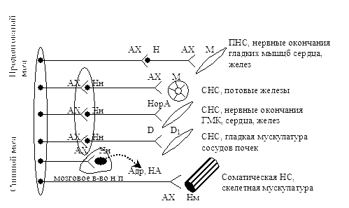 Нарисовать схему ПНС и указать на ней симпатический и парасимпатический отделы автономной нервной системы, соматические нервные волокна.