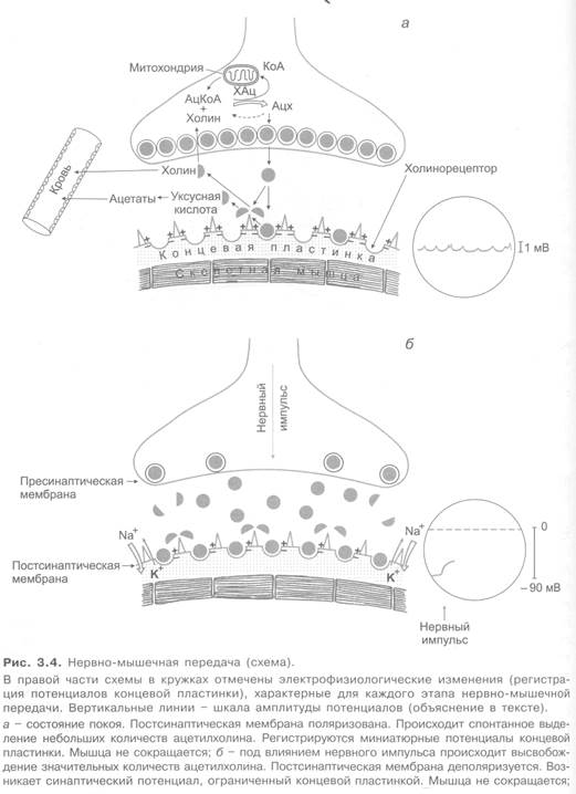 избирательного блока ганглиев (ганглиоблокирующими средствами) или нервно-мышечной передачи (курареподобными препаратами). В регуляции высвобождения ацетилхолина в нейроэффекторных синапсах принимают участие пресинаптические холино- и адренорецепторы. Их возбуждение угнетает высвобождение ацетилхолина. Взаимодействуя с н-холинорецепторами и изменяя их конформацию, ацетилхолин повышает проницаемость постсинаптической мембраны. При возбуждающем эффекте ацетилхолина ионы натрия проникают внутрь клетки, что ведет к деполяризации постсинаптической мембраны. Первоначально это проявляется локальным синаптическим потенциалом, который, достигнув определенной величины, генерирует потенциал действия. Затем местное возбуждение, ограниченное синаптической областью, распространяется по всей мембране клетки. При стимуляции м-холинорецепторов в передаче сигнала важную роль играют G-белки и вторичные передатчики [циклический аденозинмонофосфат — цАМФ; 1,2-диацилглицерол; инозитол(1,4,5)трифосфат]. Действие ацетилхолина очень кратковременно, так как он быстро гидролизуется ферментом ацетилхолинэстеразой (например, в нервно-мышечных синапсах) или диффундирует из синаптической щели (в вегетативных ганглиях). Холин, образующийся при гидролизе ацетилхолина, в значительном количестве (50%) захватывается пресинаптическими окончаниями, транспортируется в цитоплазму, где вновь используется для биосинтеза ацетилхолина. Основные этапы холинергической передачи на примере нервно-мышечных синапсов приведены на рис. 3.4. Вещества могут воздействовать на разные процессы, имеющие отношение к синаптической передаче: 1) синтез ацетилхолина; 2) высвобождение медиатора; 3) взаимодействие ацетилхолина с холинорецепторами; 4) энзиматический гидролиз ацетилхолина; 5) захват пресинаптическими окончаниями холина, образующегося при гидролизе ацетилхолина (табл. 3.1).