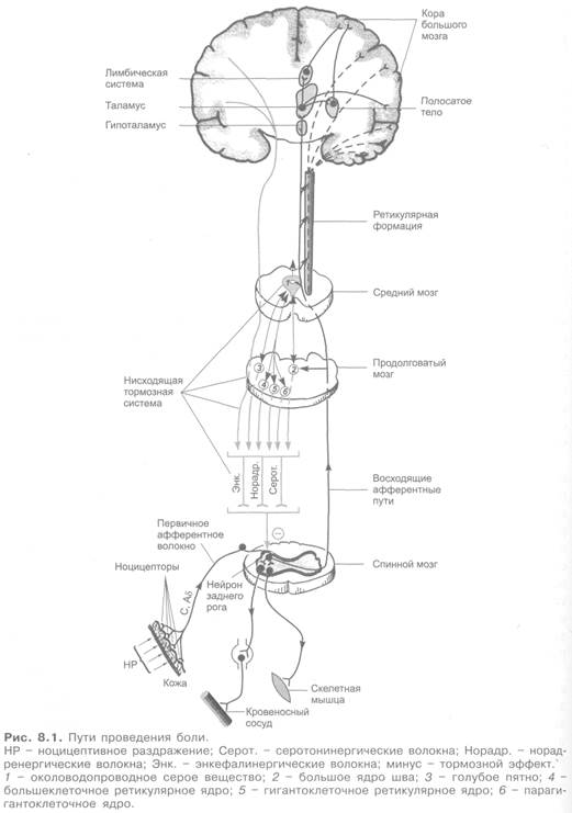 Глава 8 БОЛЕУТОЛЯЮЩИЕ (АНАЛЬГЕЗИРУЮЩИЕ) СРЕДСТВА Причиной острых и хронических болевых ощущений могут быть как органические, так и психогенные нарушения. Боль возникает при повреждающих воздействиях на кожу, слизистые оболочки, связки, мышцы, суставы, внутренние органы. Нередко боль обусловлена нарушением функции самой нервной системы. Это так называемые нейропатические боли, связанные с прямой травмой периферических нервов или мозговой ткани, с ишемией, инфекцией, разрастанием опухолей и т.д. С учетом очень большой распространенности патологических процессов, сопровождающихся болями, которые могут сохраняться месяцами и годами, значимость болеутоляющих средств трудно переоценить. Устранение или облегчение боли анальгетиками улучшает физическое и психическое состояние пациента, что благоприятно сказывается на его профессиональной и социальной жизни. Болевые ощущения воспринимаются специальными рецепторами, которые получили название «ноцицепторы». Они представляют собой окончания древовидно-разветвленных афферентных волокон, расположенных в коже, мышцах, суставных капсулах, надкостнице, внутренних органах и т.д. Повреждающими (ноцицептивными) раздражителями могут быть механические, термические и химические воздействия. Причиной боли нередко является патологический процесс (например, воспаление). Известны эндогенные вещества, которые, воздействуя на ноцицепторы, способны вызывать болевые ощущения (брадикинин, гистамин, серотонин, ионы калия и др.). Простагландины (например, Е2) повышают чувствительность ноцицепторов к химическому (и термическому) раздражению. Вызванные болевым раздражением импульсы распространяются по C- и Аδ-волокнам и поступают в задние рога спинного мозга (рис. 8.1). Здесь происходит первое переключение с афферентных волокон на вставочные нейроны. Отсюда возбуждение распространяется по ряду путей. Один из них — восходящие афферентные тракты. Они проводят возбуждение к вышележащим отделам — ретикулярной формации, таламусу, гипоталамусу, к базальным ганглиям, лимбической системе и коре большого мозга. Сочетанное взаимодействие этих структур приводит к восприятию и оценке боли с последующими поведенческими и вегетативными реакциями. Второй путь — передача импульсов на мотонейроны спинного мозга, что проявляется двигательным рефлексом. Третий путь осуществляется за счет возбуждения нейронов боковых рогов, в результате чего активируется адренергическая (симпатическая) иннервация. Функционирование нейронов задних рогов спинного мозга регулируется супраспинальной антиноцицептивной системой. Последняя представлена комплексом структур, оказывающих нисходящее тормозное влияние на передачу болевых стимулов с первичных афферентных волокон на вставочные нейроны. Например, показано, что электрическое раздражение околоводопроводного серого вещества или парагигантоклеточного ретикулярного ядра либо микроинъекция в