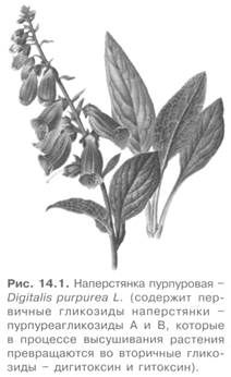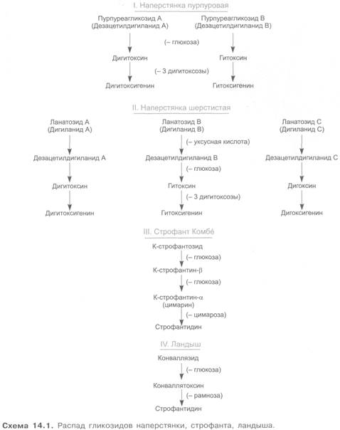 Основные пути химического превращения ряда сердечных гликозидов, содержащихся в соответствующих растениях, показаны на схеме 14.1. Они используются в фармацевтической промышленности для получения лекарственных препаратов сердечных гликозидов (особенно более стойких вторичных гликозидов). В медицинской практике наиболее широко применяют препараты сердечных гликозидов, получаемые из следующих растений: