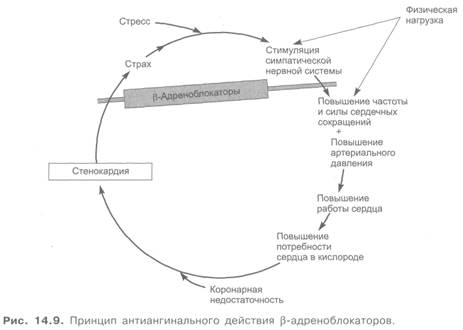 14.3.1.2. Средства, понижающие потребность миокарда в кислороде Основными представителями этой группы являются β-адреноблокаторы. Антиангинальный эффект их связан преимущественно с блоком β-адренорецепторов сердца и устранением адренергических влияний (см. в главе 14.4 схему 14.4 и рис 14.9). Это проявляется в уменьшении частоты и силы сердечных сокращений. Работа сердца уменьшается, в связи с чем падает потребность миокарда в