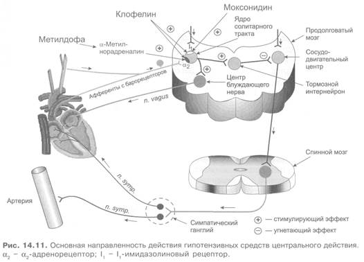 14.5.1. НЕЙРОТРОПНЫЕ ГИПОТЕНЗИВНЫЕ СРЕДСТВА При лечении гипертонической болезни, особенно начальных форм, иногда используют вещества с успокаивающим действием. Это могут быть анксиолитики или снотворные наркотического типа в небольших дозах. Обычно их назначают больным с лабильной психикой. Не исключено, что наряду с седативным действием они могут оказывать и некоторое угнетающее влияние на вазомоторные центры. К гипотензивным веществам центрального действия относится производное имидазолина клофелин (катапресан, клонидина гидрохлорид, гемитон). Его гипотензивное действие связано со стимулирующим влиянием на постсинаптические α2-адренорецепторы и имидазолиновые I1-рецепторы нейронов ядер солитарного тракта в ростральной вентролатеральной части продолговатого мозга. Это в свою очередь приводит к угнетению нейронов вазомоторного центра продолговатого мозга и снижению тонуса симпатической иннервации (рис. 14.11).