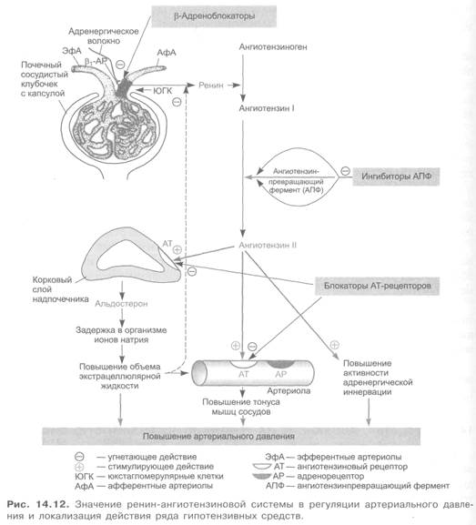 14.5.2. СРЕДСТВА, ВЛИЯЮЩИЕ НА РЕНИН-АНГИОТЕНЗИНОВУЮ СИСТЕМУ Известно, что ангиотензин II относится к наиболее активным эндогенным вазопрессорным веществам и, кроме того, принимает участие в регуляции продукции альдостерона (рис. 14.12). Поэтому и возникла идея создания веществ, угнетающих ренин-ангиотензиновую систему. Одно направление исследований связано с поиском веществ, снижающих содержание в плазме протеолитического фермента ренина (образуется в почках, в юкстагломерулярных клетках), который обеспечивает превращение ангиотензиногена в ангиотензин I (оба вещества не обладают активностью). В дальнейшем из ангиотензина I образуется вазоактивный ангиотензин II (см. ниже). Естественно, что вещества, угнетающие продукцию ренина, должны быть наиболее эффективны при повышенном его высвобождении. Последнее возникает в следующих ситуациях:
