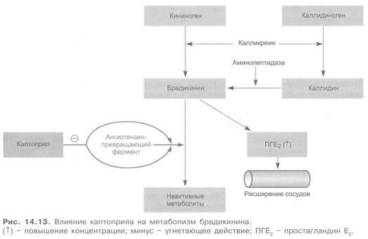 Исходя из этих данных, продукцию ренина можно уменьшить, понижая тонус адренергической иннервации. Это можно осуществить как за счет снижения центрального симпатического тонуса (клофелин, метилдофа), так и путем блокады передачи импульсов на уровне пресинаптических окончаний (октадин, резерпин) и β1-адренорецепторов (анаприлин и др.). В гипотензивном действии указанных нейротропных препаратов снижение выделения ренина может иметь определенное значение, но обычно небольшое. Снижение продукции ренина наблюдается также при угнетении синтеза простагландинов (простациклина, ПГЕ2), которые стимулируют образование и высвобождение ренина. Таким эффектом обладают нестероидные противовоспалительные средства (индометацин и др.), ингибирующие циклооксигеназу и благодаря этому подавляющие биосинтез простагландинов. Имеются препараты, которые оказывают прямое ингибирующее действие на ренин (эналкирен, ремикирен), снижая его активность. Однако эти вещества изучены недостаточно, и оценивать их перспективы затруднительно. Большой интерес представляют препараты, ингибирующие ангиотензинпревращающий фермент. Последний является пептидилдипептидгидролазой (кининаза II). Образуется в эндотелии сосудов, в легких, почках и других периферических тканях. Этот фермент способствует превращению ангиотензина I в высокоактивный ангиотензин II. Первым непептидным ингибитором ангиотензинпревращающего фермента был каптоприл (капотен), применяемый и в настоящее время. Он обладает высоким сродством (аффинитетом) к ангиотензинпревращающему ферменту, намного превышающим таковое для ангиотензина I. На центральную и вегетативную нервную систему каптоприл не влияет. Основное его действие связано с уменьшением образования ангиотензина II. Это проявляется меньшей активацией ангиотензиновых рецепторов сосудов и коры надпочечников, а также уменьшением стимулирующего влияния на симпатическую иннервацию (в ЦНС и на периферии). При этом тонус резистивных сосудов снижается. Может наблюдаться и некоторое расширение вен. Уменьшается высвобождение минералокортикоида альдостерона, что приводит к меньшей задержке в организме ионов натрия и сокращению объема экстрацеллюлярной жидкости. Все это в целом вызывает снижение общего периферического сопротивления. Сердечный выброс и частота сердечных сокращений существенно не изменяются (сердечный выброс может меняться при длительном применении каптоприла). Следует иметь в виду, что, ингибируя ангиотензинпревращающий фермент (кининазу II), каптоприл замедляет инактивацию брадикинина, вызывающего сосудорасширяющий эффект (рис. 14.13). Как известно, брадикинин способствует высвобождению простациклина, простагландина Е2 и других веществ, оказывающих сосудорасширяющее действие. Роль простагландинов в гипотензивном действии