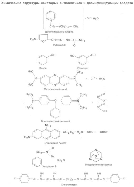 Бриллиантовый зеленый является высокоактивным и относительно быстродействующим антисептиком. В присутствии белков эффективность его снижается. Применяется наружно, в основном при гнойных поражениях кожи (пиодермиях). Метиленовый синий (метилтиония хлорид, метиленовый синий) уступает по активности бриллиантовому зеленому. Применяют его наружно в качестве антисептика, внутрь при инфекциях мочевыводящих путей, а также внутривенно при отравлении цианидами. Эффективность в последнем случае объясняется тем, что метиленовый синий (в больших дозах) переводит гемоглобин в метгемоглобин, который вступает в связь с цианидами, образуя нетоксичный цианметгемоглобин. Этакридина лактат (риванол) окрашен в желтый цвет. Активность у него достаточно высокая, но действие развивается медленно. Применяют его наружно и для промывания инфицированных полостей (плевры, брюшины), мочевого пузыря, матки. Галогеносодержащие антисептики представлены препаратами, содержащими хлор и йод. Наиболее активны антисептики, содержащие элементарные галогены или освобождающие их. Одним из препаратов, отщепляющих хлор, является хлорамин Б, обладающий антисептическими и дезодорирующими свойствами. Его применяют для обеззараживания выделений больных (например, при брюшном тифе, холере, туберкулезе и др.), предметов обихода, неметаллического инструментария, а также для обработки рук и инфицированных раневых поверхностей. К числу эффективных хлорсодержащих антисептиков относится производное бигуанида хлоргексидин (хибитан). Он оказывает антибактериальное и фунгицидное действие. Применяется для обработки рук хирурга, операционного поля, ран, мочевого пузыря, а также для стерилизации инструментов. При обработке рук хирурга возможны сухость кожи, дерматиты. К хлорсодержащим препаратам относится также пантоцид, используемый для обеззараживания воды. В качестве антисептика широко используется раствор йода спиртовой, который характеризуется также раздражающим и отвлекающим действием. Кроме того, к препаратам, содержащим элементарный йод, относится раствор Люголя (состоит из 1 части йода, 2 частей калия йодида и 17 частей воды), применяемый для смазывания слизистой оболочки глотки и гортани при воспалительных процессах. Значительное число антисептиков представлено соединениями (солями) металлов. Механизм противомикробного действия солей металлов в низких концентрациях связывают с блокированием сульфгидрильных групп ферментов микроорганизмов. В больших концентрациях в зависимости от характера металла и кислотного остатка, концентрации соли, степени ее диссоциации и растворимости могут возникать различные местные эффекты: вяжущий, раздражающий, прижигающий (некротизирующий). Местное действие солей металлов связано с денатурацией белков. Образующиеся при этом альбуминаты могут быть плотными и рыхлыми. В первом случае на поверхности ткани образуется пленка, ткань уплотняется, воспаление уменьшается, эта картина типична для вяжущего действия. При более глубоком проникновении вещества происходит раздражение клеток и нервных окончаний. Крайним проявлением является прижигающее действие солей металлов. Последнее тем выраженнее, чем более растворимы альбуминаты. По растворимости образующихся альбуминатов в воде и биологических жидкостях ме