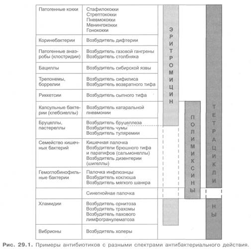 29.1. АНТИБИОТИКИ Антибиотики — это химические соединения биологического происхождения, оказывающие избирательное повреждающее или губительное действие на микроорганизмы. Антибиотики, применяемые в медицинской практике, продуцируются актиномицетами (лучистыми грибами), плесневыми грибами, а также некоторыми бактериями. К этой группе препаратов относят также синтетические аналоги и производные природных антибиотиков. Существуют антибиотики с антибактериальным, противогрибковым и противоопухолевым действием. В настоящем разделе будут рассмотрены антибиотики, влияющие преимущественно на бактерии. Они представлены следующими группами: 1. Антибиотики, имеющие в структуре β-лактамное кольцо Пенициллины Цефалоспорины Карбапенемы Монобактамы 2. Макролиды — антибиотики, структура которых включает макроциклическое лактонное кольцо (эритромицин и др.), и азалиды (азитромицин) 3. Тетрациклины — антибиотики, структурной основой которых являются 4 конденсированных 6-членных цикла (тетрациклин и др.) 4. Производные диоксиаминофенилпропана (левомицетин) 5. Аминогликозиды — антибиотики, содержащие в молекуле аминосахара (стрептомицин, гентамицин и др.) 6. Антибиотики из группы циклических полипептидов (полимиксины) 7. Линкозамиды (линкомицин, клиндамицин и др.) 8. Гликопептиды (ванкомицин и др.) 9. Фузидиевая кислота 10. Разные антибиотики По спектру противомикробного действия антибиотики различаются довольно существенно. Одни влияют преимущественно на грамположительные бактерии (биосинтетические пенициллины, макролиды), другие — в основном на грамотрицательные бактерии (например, полимиксины, азтреонам). Ряд антибиотиков обладают широким спектром действия (тетрациклины, цефалоспорины, левомицетин, аминогликозиды и др.), включающим грамположительные и грамотрицательные бактерии и ряд других возбудителей инфекций (табл. 29.1; рис. 29.1).