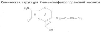 По строению цефалоспорины сходны с пенициллинами (см. химические структуры). Так, обе группы антибиотиков содержат β-лактамное кольцо (л). Однако имеются и существенные различия: структура пенициллинов включает тиазолидиновое кольцо, а цефалоспоринов — дигидротиазиновое (д). Действуют цефалоспорины бактерицидно, что связано с их угнетающим влиянием на образование клеточной стенки. Аналогично пенициллину они угнетают активность фермента транспептидазы, участвующей в биосинтезе клеточной стенки бактерий.