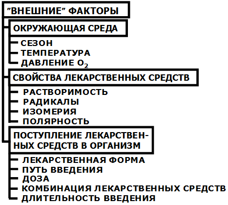 РЕЗЮМЕ. Вариабельность действия лекарственных средств в популяции людей определяется «внешними» и «внутренними» факторами. Поэтому врач, назначая лекарственное средство, должен учитывать их вклад в развитие лечебного, побочного и токсического действия лекарственных средств.